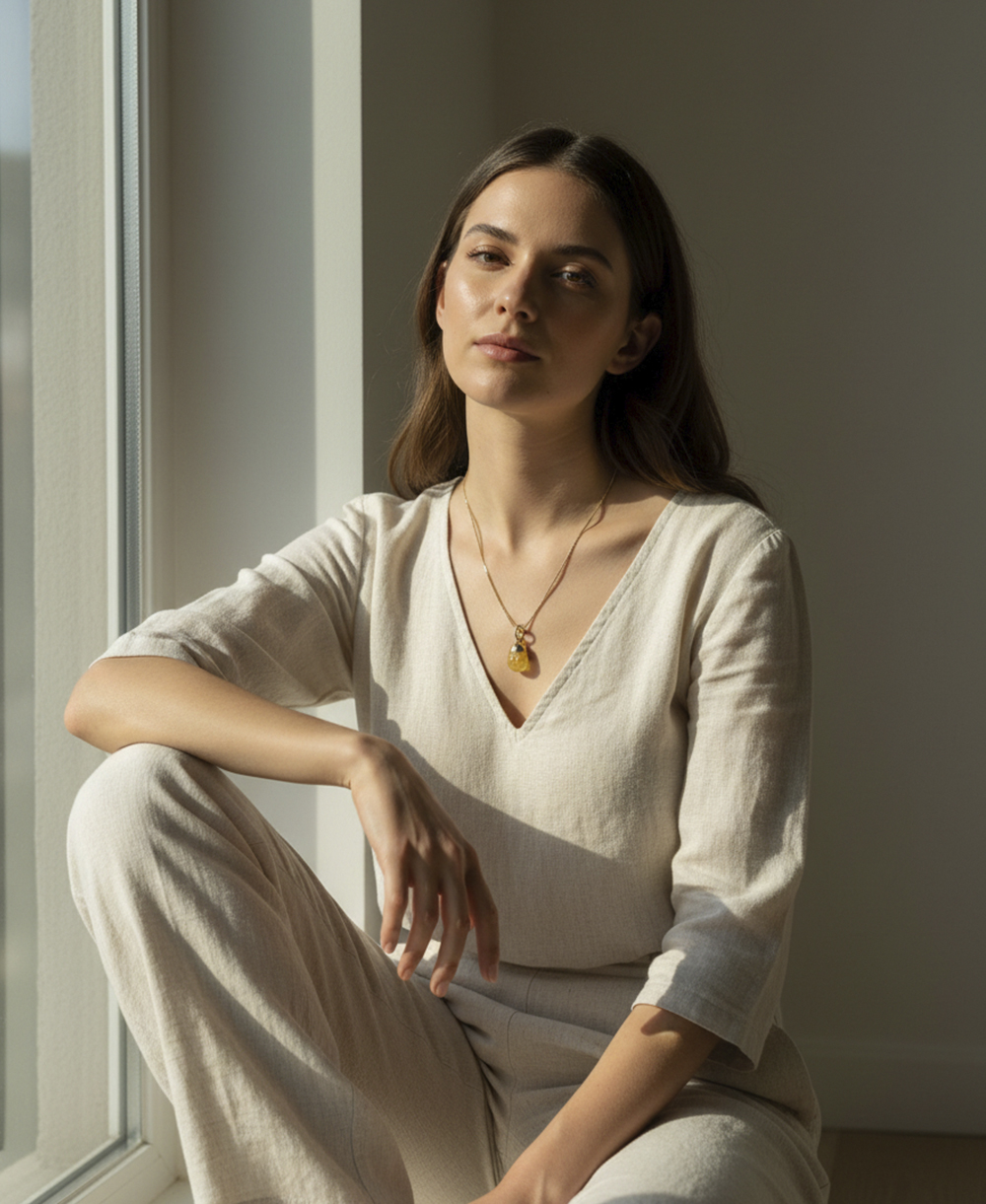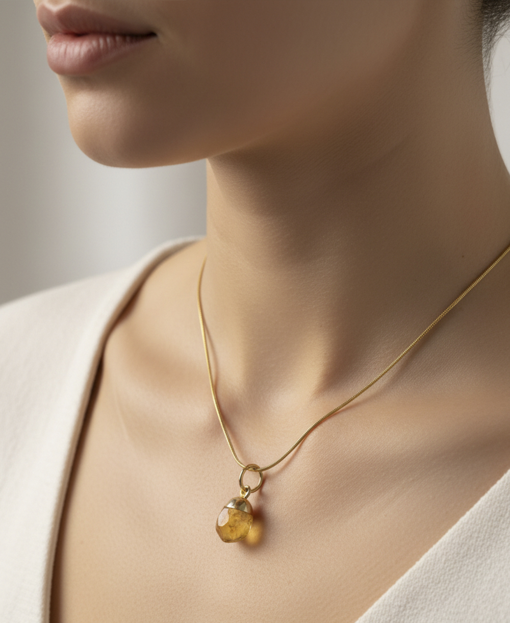 A poetic blend of nature and refinement — this 18K gold plated necklace features raw sea glass paired with a warm citrine drop, celebrating imperfect beauty and timeless elegance.