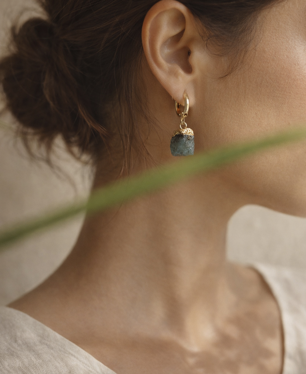 Suspended from sleek gold-plated huggie hoops, the design sits close to the ear for a refined and contemporary silhouette. The contrast between raw Emerald and polished 18K gold plating creates a timeless aesthetic — earthy yet elevated.